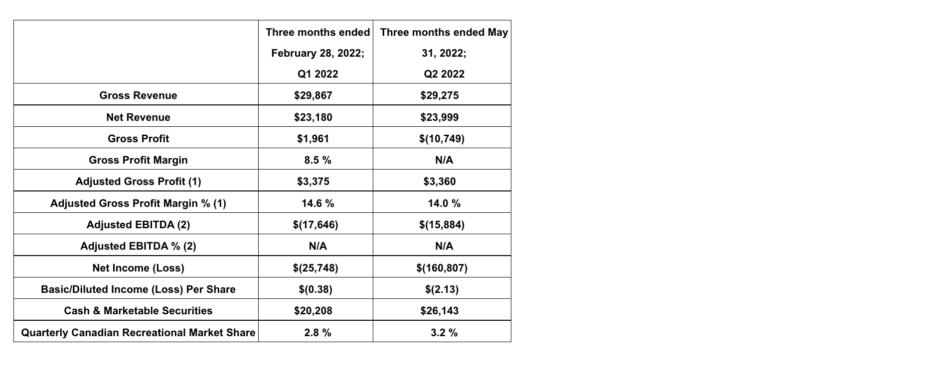 1. Management utilizes this measure to provide a representation of performance in the period by excluding the inventory impairment measurement adjustments and impacts of biological asset changes as required by IFRS. Adjusted gross profit is a non-GAAP ratio, which management believes provides useful information as it represents gross profit for management purposes based on costs to manufacture, package and ship inventory sold, exclusive of any impairments due to changes in internal or external influences impacting the net realizable value of inventory and non-cash items. See reconciliation of “Adjusted Gross Profit (non-GAAP measure)” in the Company’s Management’s Discussion and Analysis for the quarter ended May 31, 2022.