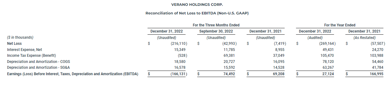Net loss for fourth quarter 2022 was $(216) million, down from $(7) million for fourth quarter 2021, and down from $(43) million for third quarter 2022. The increase in net loss for fourth quarter 2022 compared to fourth quarter 2021 was driven by a $229 million impairment charge, primarily of intangible assets related to the Arizona cultivation license and Pennsylvania and Arizona retail reporting units.