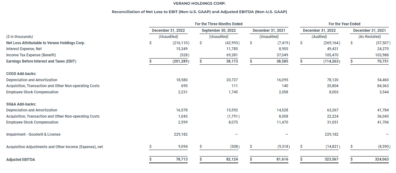 Verano uses non-U.S. GAAP financial information to evaluate the performance of the Company. The terms “EBIT,” “EBITDA,” “Adjusted EBITDA,” and “Free Cash Flow” do not have any standardized meaning prescribed within U.S. GAAP and therefore may not be comparable to similar measures presented by other companies. Accordingly, this non-U.S. GAAP financial information is intended to provide additional information and should not be considered in isolation or as a substitute for measures of performance prepared in accordance with U.S. GAAP.