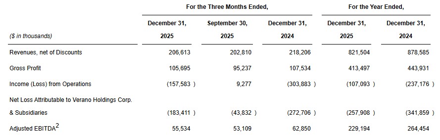 Verano Announces Fourth Quarter and Full Year 2025 Financial Results