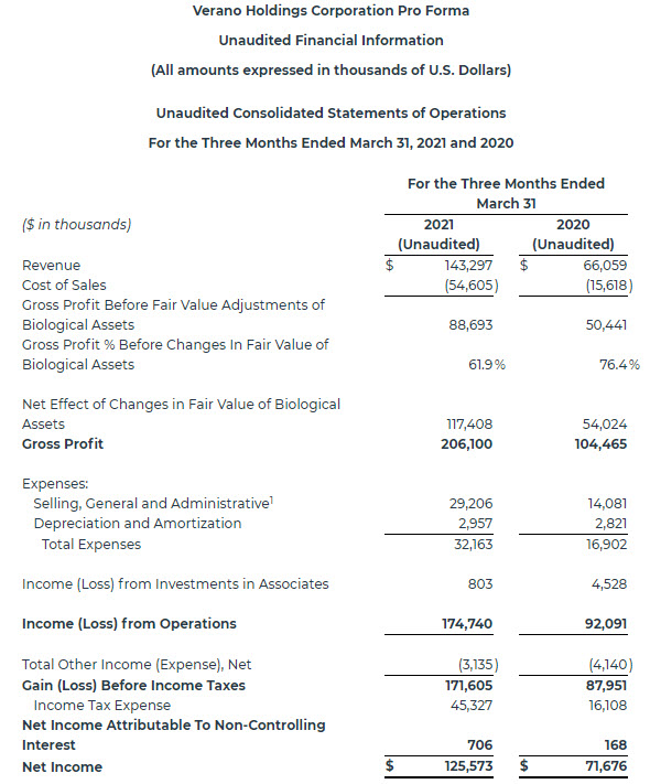 The financial information reported in this news release is based on the unaudited financial statements of Verano Holdings Corp. and the related management discussion and analysis (“MD&A”) for the three months ended March 31, 2021, both of which are available under the Company’s profile on SEDAR at www.SEDAR.com. All financial information contained in this news release is qualified in its entirety with reference to such financial statements and MD&A.