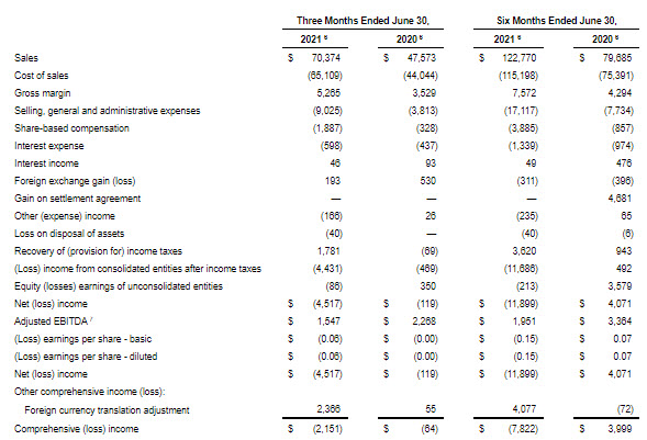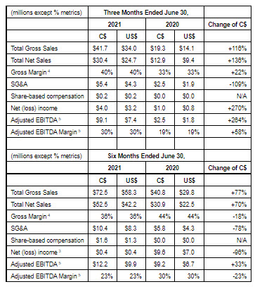 4. Gross margin for the three months and six months ended June 30, 2021 excludes the C$145 (US$133) and C$3,824 (US$3,058), respectively, inventory adjustment charge from the revaluation of inventory to fair value at the acquisition date of November 2, 2020.