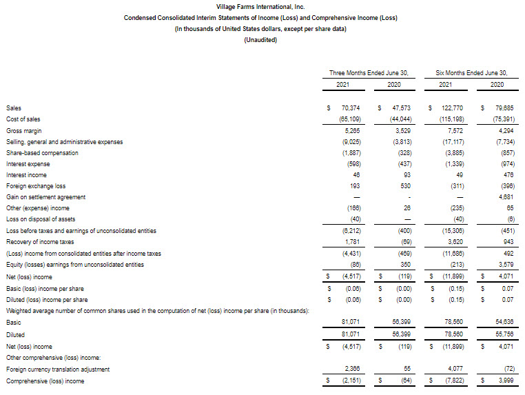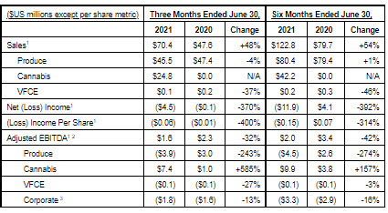 VANCOUVER, BC, Aug. 9, 2021 /PRNewswire/ – Village Farms International, Inc. (“Village Farms” or the “Company”) (NASDAQ: VFF) (TSX: VFF) today announced its financial results for the second quarter ended June 30, 2021. All figures are in U.S. dollars unless otherwise indicated. For Consolidated Results see below.