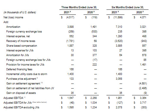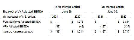 6. For the three and six months ended June 30, 2021, Pure Sunfarms is fully consolidated in the financial results of the Company. For the three and six months ended June 30, 2020, Village Farms share of Pure Sunfarms earnings are reflected in equity (losses) earnings of unconsolidated entities.