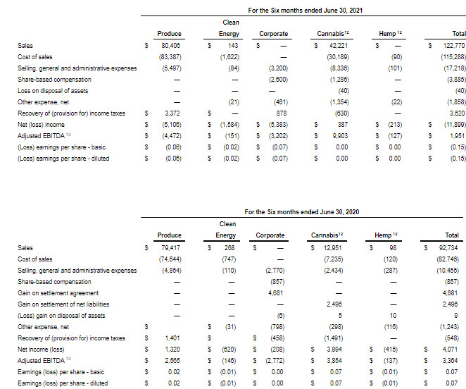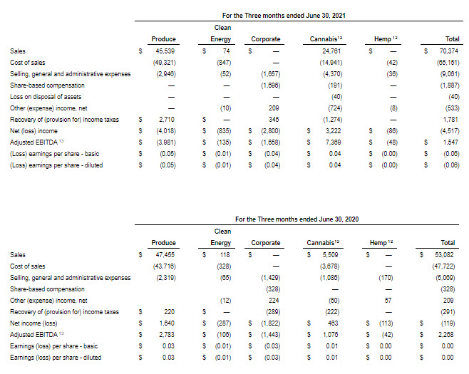 Net loss for the three months ended June 30, 2021 was ($4,517) as compared to ($119) for the three months ended June 30, 2020. The increase in net loss was primarily due to a lower gross margin from our produce operations and higher corporate share-based compensation, partially offset by an improved operating profit for Pure Sunfarms in the three months ended June 30, 2021 as compared to June 30, 2020.