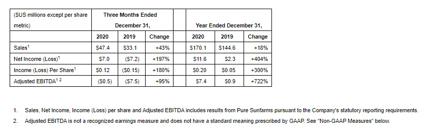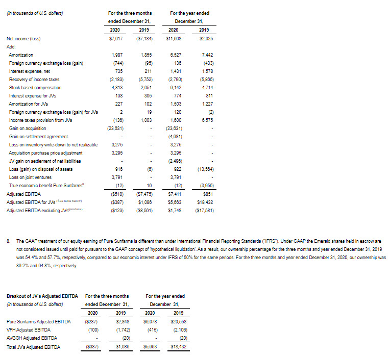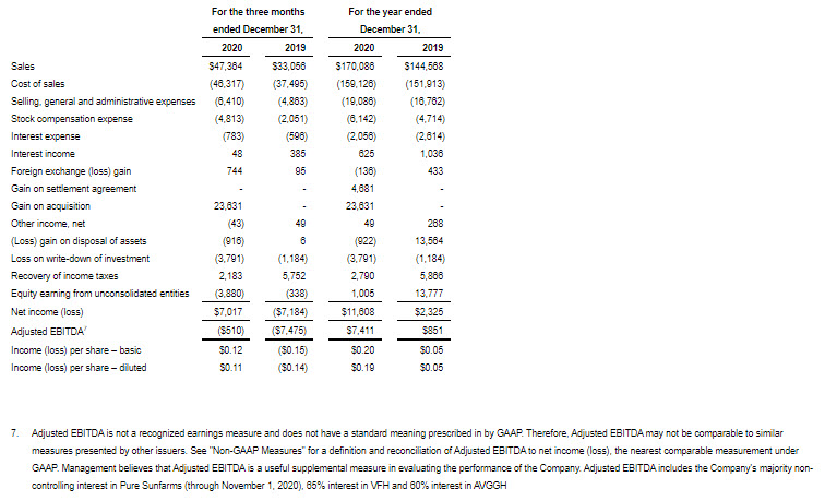 - Achieved its eighth consecutive quarter of net income (before the $3.3 million non-cash impact resulting from the write-up of inventory required under GAAP with the acquisition of the remaining interest in Pure Sunfarms on November 2, 2020) and its ninth consecutive quarter of positive Adjusted EBITDA;