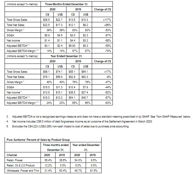 “This contributed to our ninth consecutive quarter of profitability, even as we invested during the quarter to support our future growth. 2020 was a year that saw Pure Sunfarms prove out its cultivation excellence and its differentiated product strategy, becoming a leading brand and consistently delivering profitability – all of which was accomplished amidst the challenges of the pandemic. We are building on this momentum in 2021 with plans to start cultivation in our Delta 2 greenhouse in the second half of the year to meet the strong and growing demand for Pure Sunfarms’ products, as we continue to enhance and expand our offerings to participate in, and help drive the growth of, the Canadian cannabis market. We look forward to continued growth in branded retail sales in 2021 and we are opportunistic with respect to sales to other producers as many of them look to Pure Sunfarms as an economic source of consistent, high quality flower.”
