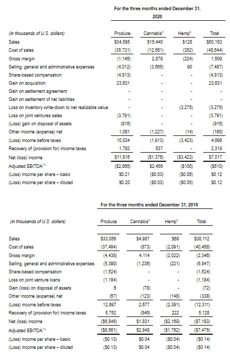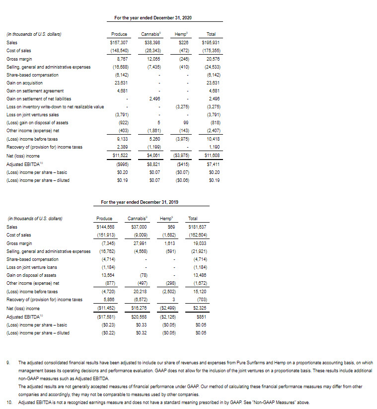 “Finally, alongside the momentum at Pure Sunfarms, our produce business had a strong 2020, driven by higher pricing amidst elevated demand across our national and regional grocer and “big box” customers for much of the year. Our significant progress over the last two years in transitioning capacity designated for cannabis to growing partners enabled us to take full advantage of these market dynamics, coupled with year on year improvements at our Texas green house facilities, drove a $16.5 million year over-year improvement in Adjusted EBITDA to support our longer-term growth opportunities in cannabis.”
