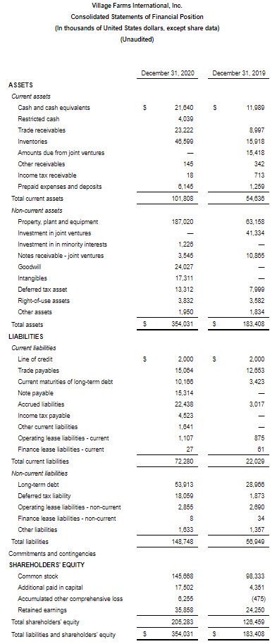This press release is intended to be read in conjunction with the Company’s Consolidated Financial Statements (“Financial Statements”) and Management’s Discussion & Analysis (“MD&A”) for the three months and year ended December 31, 2020 in the Company Form 10-Q, which will be filed on (www.sec.gov/edgar.shtml) and SEDAR (www.sedar.com) and will be available at www.villagefarms.com.