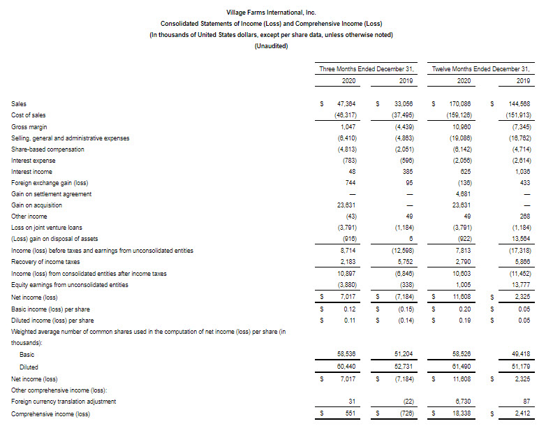 VANCOUVER, BC, March 16, 2021 /PRNewswire/ – Village Farms International, Inc. (“Village Farms” or the “Company”) (NASDAQ: VFF) (TSX: VFF) today announced its financial results for the three months and year ended December 31, 2020. All figures are in U.S. dollars unless otherwise indicated.