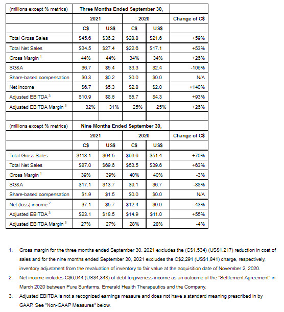 Canadian cannabis net income for the three months ended September 30, 2021 was $5,287 (C$6,661) as compared to net income of $3,221 ($3,988) for the three months ended June 30, 2021. The higher net income between periods was primarily driven by a higher gross margin from an increase in non-branded sales while selling, general and administrative expenses remained relatively consistent as a percentage of revenue.