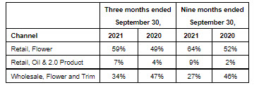 U.S. cannabis net sales for the period of August 16, 2021 to September 30, 2021 were $3,838. Over 99% of sales are generated in the United States and gross sales are composed of 80% from e-commerce sales, 17% from retail sales, 3% from shipping income and 1% from bulk sales offset by a (1%) loyalty program impact as loyalty program customers generate loyalty points that may be used when purchasing Balanced Health products.