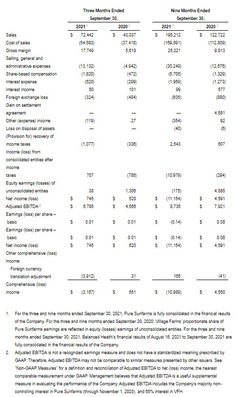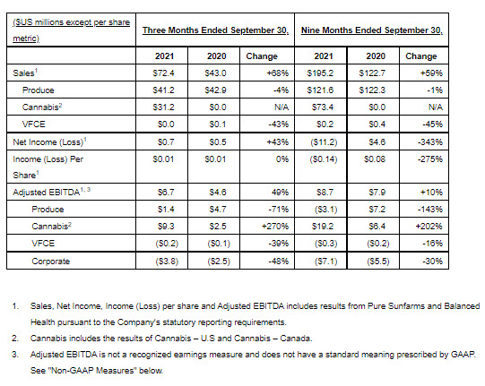 Village Farms International Reports Third Quarter 2021 Financial Results: Adjusted EBITDA Up 49% Year-Over-Year /Another Record Quarter for Pure Sunfarms’ Sales and Adjusted EBITDA