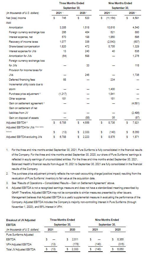 - Total Canada and U.S. cannabis adjusted EBITDA (Pure Sunfarms and Balanced Health Botanicals combined) was $9.3 million, which included Pure Sunfarms Adjusted EBITDA of $8.6 million and Balanced Health Adjusted EBITDA of $0.7 million;