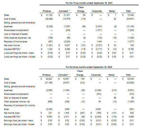 Adjusted EBITDA for the three months ended September 30, 2021 was $6,785 compared to $4,556 for the three months ended September 30, 2020. The 49% increase in adjusted EBITDA was primarily due to improved operating results of the cannabis business which includes the addition of the U.S. cannabis segment’s positive operating results, partially offset by the lower operating profit of the produce business and an increase in corporate expenses. See the reconciliation of Adjusted EBITDA to net income in “Non-GAAP Measures—Reconciliation of Net Earnings to Adjusted EBITDA”.