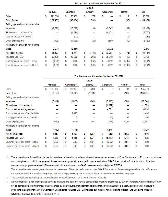 The Canadian cannabis segment currently consists of Pure Sunfarms. Pure Sunfarms’ comparative analysis are based on the consolidated results of Pure Sunfarms for the three and nine months ended September 30, 2021 and September 30, 2020, not accounting for the percentage owned by Village Farms. See “Reconciliation of U.S. GAAP Results to Proportionate Results” for a presentation of the cannabis segment’s proportionate results for the three and nine months ended September 30, 2021 and September 30, 2020.