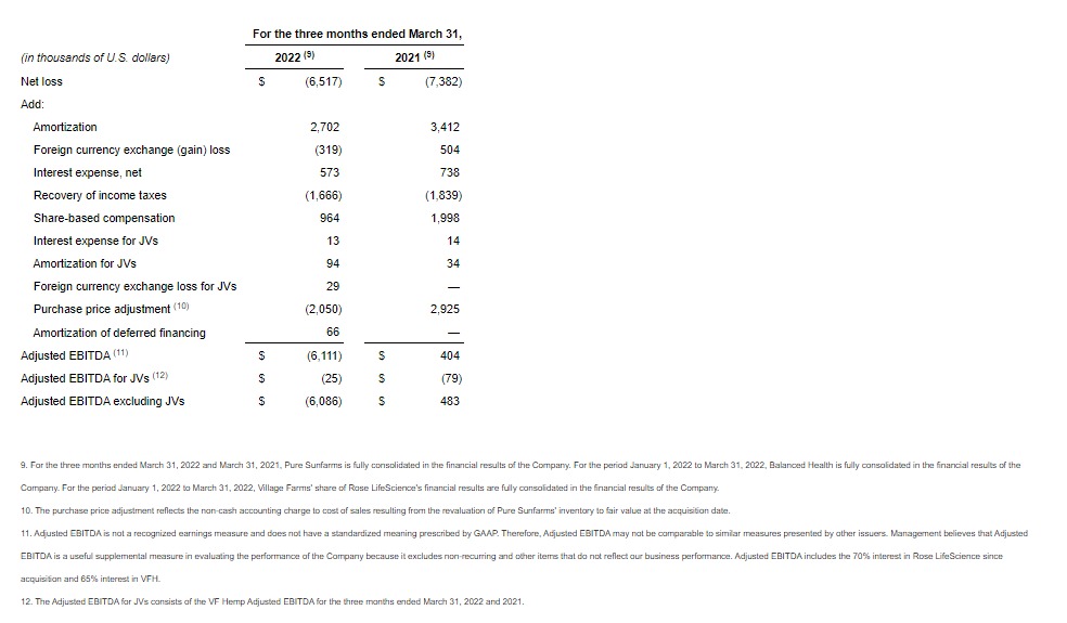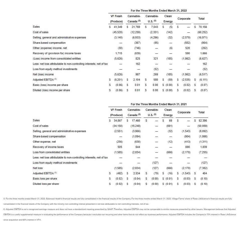 - U.S. Cannabis net sales were $7.0 million, with a gross margin of 67% and adjusted EBITDA of $0.6 million. There are no year-over-year comparisons since Balanced Health Botanicals was acquired by Village Farms on August 16, 2021.