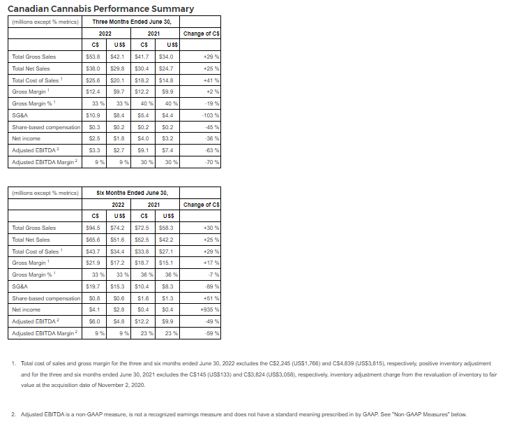 The continued successful execution of our differentiated Canadian Cannabis strategy drove strong year-over-year and sequential sales growth, achieving a new record high for the second quarter, as well as our 15th consecutive quarter of positive EBITDA for that business.