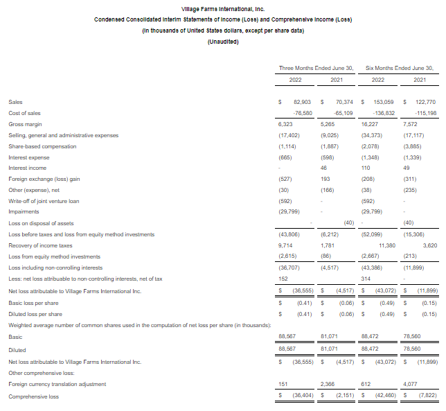 VANCOUVER, BC, Aug. 9, 2022 /PRNewswire/ – Village Farms International, Inc. (“Village Farms” or the “Company”) (NASDAQ: VFF) (TSX: VFF) today announced its financial results for the second quarter ended June 30, 2022. All figures are in U.S. dollars unless otherwise indicated.