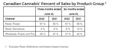 Canadian Cannabis (Pure Sunfarms and Rose LifeScience) Financial Summary for the Three and Six Months Ended June 30, 2022 and June 30, 2021