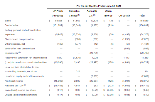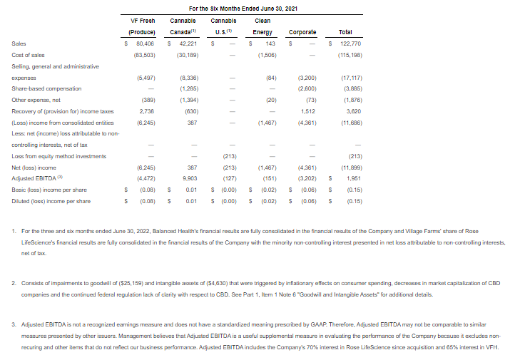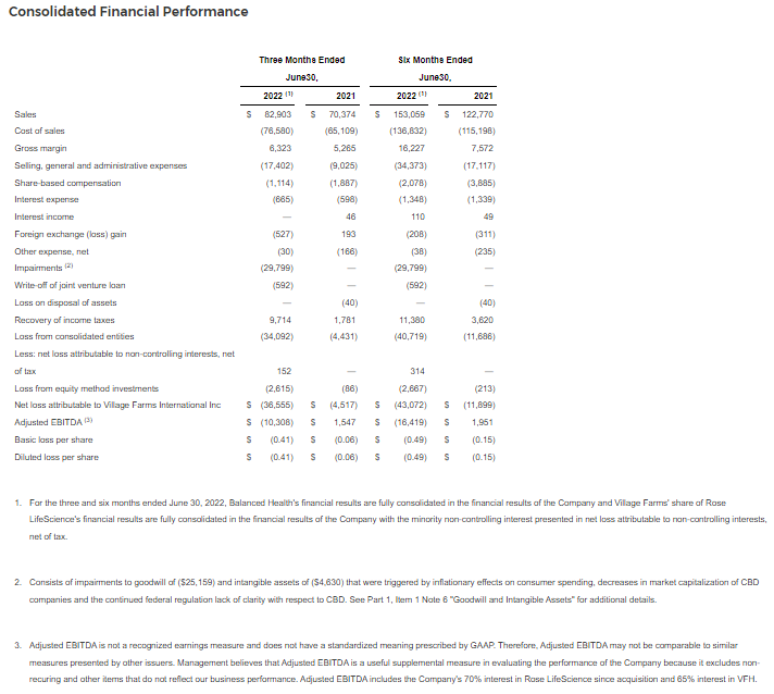 - For the three and six months ended June 30, 2022, Balanced Health’s financial results are fully consolidated in the financial results of the Company and Village Farms’ share of Rose LifeScience’s financial results are fully consolidated in the financial results of the Company with the minority non-controlling interest presented in net loss attributable to non-controlling interests, net of tax.