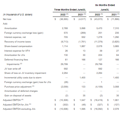- The Adjusted EBITDA for JVs consists of the VF Hemp Adjusted EBITDA for the three and six months ended June 30, 2022 and 2021.