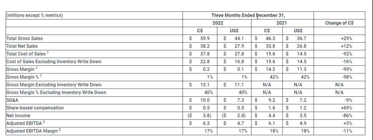 - Canadian Cannabis cost of sales included an inventory write down of $11.0 million (C$15.0 million) of lower potency flower that was more than 12 months old, with the write down partially attributable to lower pricing in the non-branded market. Excluding the write down, gross margin for Canadian Cannabis was 40%, consistent with its stated target range of 30% to 40%; and