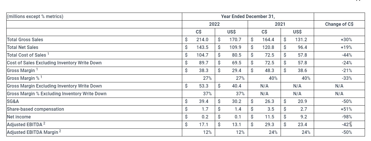 - Total cost of sales and gross margin for the three months and twelve months ended December 31, 2022 include a one-time inventory write down of C$15,000 (US$11,038). Total cost of sales and gross margin for the year ended December 31, 2022 excludes a US$1,404 catch-up of intangible amortization resulting from the finalization of Rose purchase price accounting in the third quarter of 2022. The year ended December 31, 2021, cost of sales excludes the C$2,291 (US$1,841) inventory adjustment charge from the revaluation of inventory to fair value at the acquisition date of November 2, 2020.