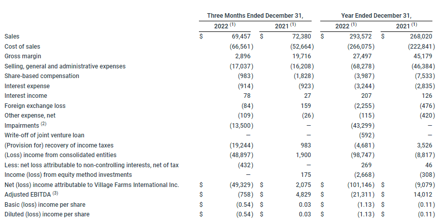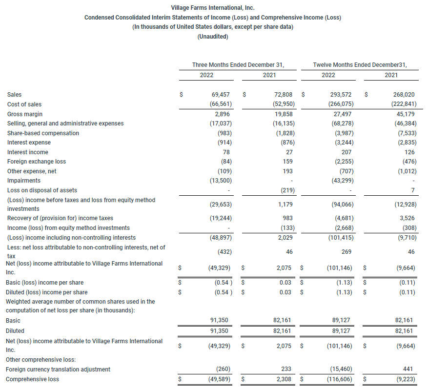 A detailed discussion of our consolidated and segment results can be found in our Annual Report on Form 10-K for the 12 months ended December 31, 2022 (the “Annual Report”), which will be filed with the Securities and Exchange Commission and will be available at www.sec.gov, and will also be filed in Canada on SEDAR (www.sedar.com). In addition, the Annual Report can be found on the Village Farms website under Financial Reports (https://villagefarms.com/financial-reports/) within the Investors section.