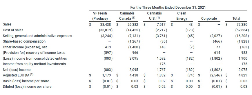 - Total Cannabis segment net sales decreased (2.0%) year-over-year to $33.2 million, representing 47.9% of total Village Farms sales; and,