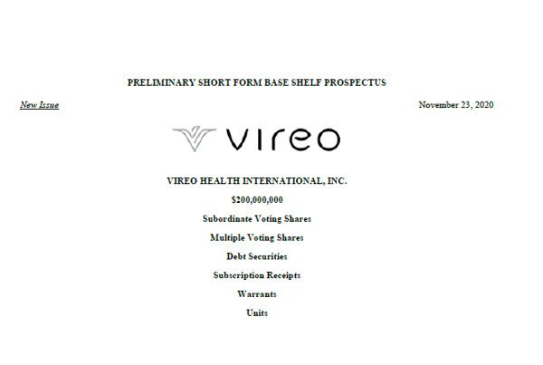 MINNEAPOLIS, Nov. 23, 2020 /CNW/ — Vireo Health International, Inc. (“Vireo” or the “Company”) (CNSX: VREO, OTCQX: VREOF), today announced that it has filed a preliminary base shelf prospectus with the securities regulators in each province of Canada, except for the Province of Quebec. The preliminary base shelf prospectus has not yet become final for the purpose of the sale of securities. The intention of the base shelf prospectus is to allow the Company to more efficiently access capital when market opportunities permit.