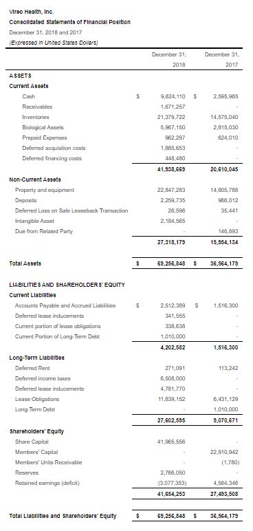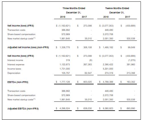 EBITDA was $1.8 million in Q4 2018, as compared to $603,020 in Q4 2017. Excluding transaction costs, share-based compensation expenses, and new market start-up costs, Vireo generated Adjusted EBITDA of $4.3 million in Q4 2018. For FY 2018, EBITDA was $4.8 million, as compared to $163,352 in 2017. Excluding transaction costs, share-based compensation expenses, and new market start-up costs, Adjusted EBITDA was $9.4 million for the year, as compared to $693,890 in 2017. Please refer to the Supplemental Information and Reconciliation of Non-IFRS Financial Measures at the end of this press release for additional information.