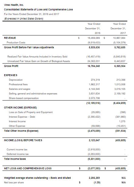 Net loss attributable to Vireo in Q4 2018 was $1.2 million, as compared to net income of approximately $273,098 in Q4 2017. For the FY 2018, net loss was $3.1 million, compared to a net loss of approximately $430,689 in FY 2017.