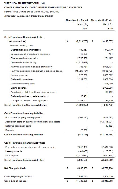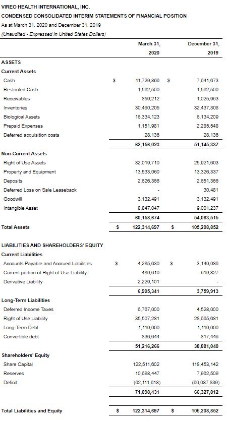 Additional information relating to the Company’s first quarter 2020 results is available on SEDAR at www.sedar.com. Vireo Health refers to certain non-IFRS financial measures such as adjusted net income, Earnings Before Interest, Taxes, Depreciation and Amortization (EBITDA) and adjusted EBITDA (defined as earnings before interest, taxes, depreciation, amortization, less certain non-cash equity compensation expense, one-time transaction fees, and other non-cash items. These measures do not have any standardized meaning prescribed by IFRS and may not be comparable to similar measures presented by other issuers. Please see the Supplemental Information and Reconciliation of Non-IFRS Financial Measures at the end of this news release for more detailed information regarding non-IFRS financial measures.