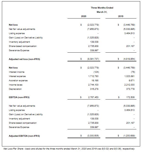 Net loss in Q1 2020 was $2.0 million, as compared to net loss of $3.4 million in Q1 2019. Adjusted net loss for Q1 2020 was $8.1 million, as compared to a loss of $4.8 million in the prior year quarter. Adjusted EBITDA, as described in accompanying disclosures and footnotes, was a loss of $3.3 million in Q1 2020, as compared to a loss of $1.2 million in Q1 2019. Please refer to the Supplemental Information and Reconciliation of Non-IFRS Financial Measures at the end of this press release for additional information.