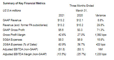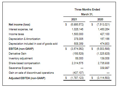 EBITDA, as described in accompanying disclosures and footnotes, was a loss of $3.6 million during Q1 2021, compared to a loss of $5.0 million in Q1 2020. Adjusted EBITDA was a loss of $1.8 million in Q1 2021, as compared to a loss of $3.1 million in Q1 2020. Please refer to the Supplemental Information and Reconciliation of Non-GAAP Financial Measures at the end of this press release for additional information.