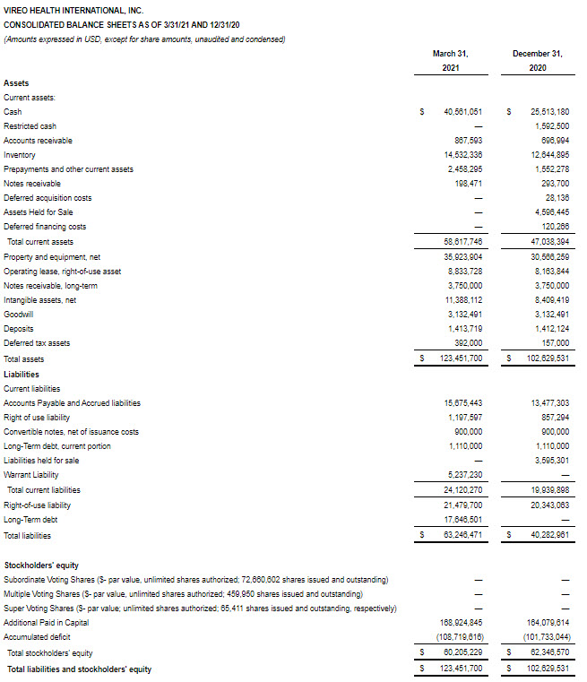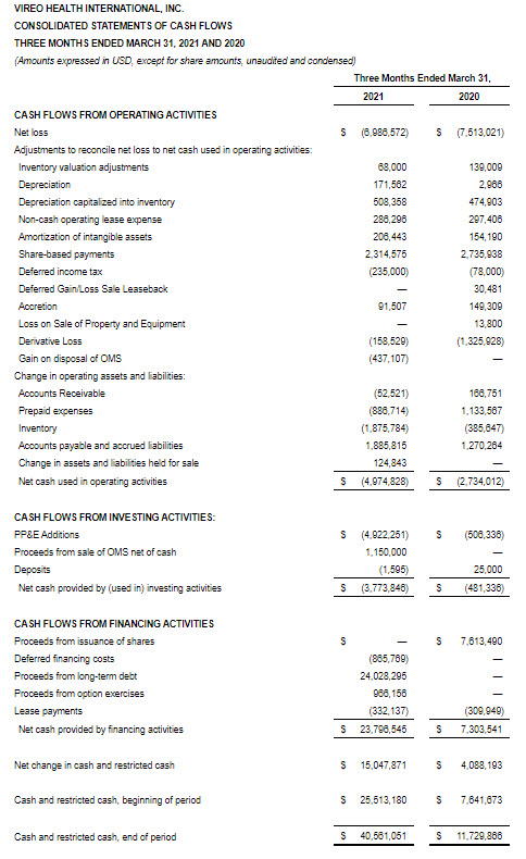 - On March 31, the Company closed on the previously announced transaction to divest its former affiliate, Ohio Medical Solutions, Inc. In connection with the closing of the transaction, Vireo received cash proceeds of $1.15 million, and was relieved of $3.6 million in right of use liabilities affiliated with lease obligations.