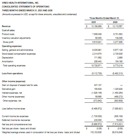 Total other expenses were $373,842 during Q1 2021, a reduction of $219,766 compared to $593,608 in Q1 2021. The decrease was primarily attributable to the gain on the divestiture of Ohio Medical Solutions, Inc. during the quarter.