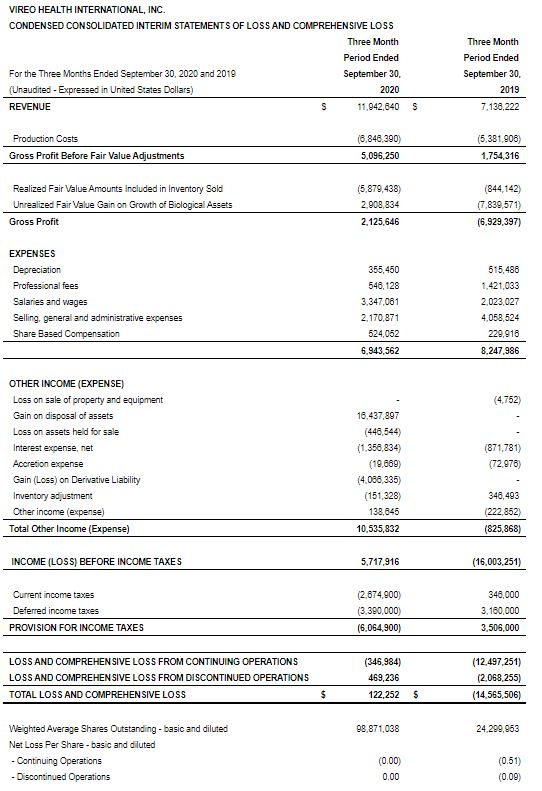 Additional information relating to the Company’s third quarter 2020 results is available on SEDAR at www.sedar.com. Vireo refers to certain non-IFRS financial measures such as adjusted net income, Earnings Before Interest, Taxes, Depreciation and Amortization (EBITDA) and adjusted EBITDA (defined as earnings before interest, taxes, depreciation, amortization, less certain non-cash equity compensation expense, one-time transaction fees, and other non-cash items. These measures do not have any standardized meaning prescribed by IFRS and may not be comparable to similar measures presented by other issuers. Please see the Supplemental Information and Reconciliation of Non-IFRS Financial Measures at the end of this news release for more detailed information regarding non-IFRS financial measures.
