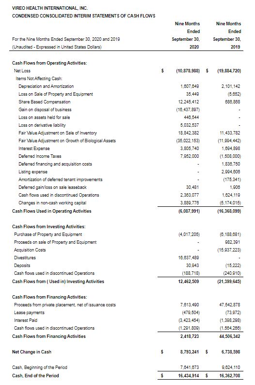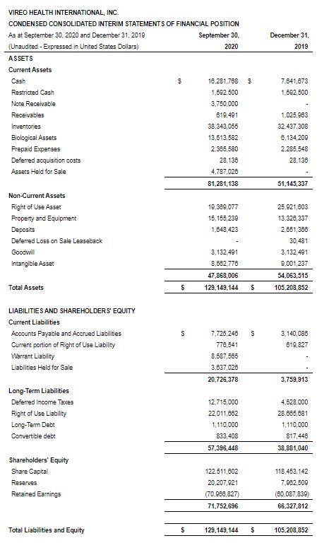 Vireo Health Announces Third Quarter 2020 Financial Results