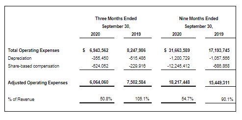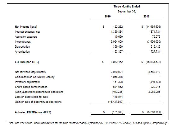 EBITDA, as described in accompanying disclosures and footnotes, was $8.1 million during Q3 2020, compared to a loss of $15.9 million in Q3 2019. Adjusted EBITDA was a loss of $675,808 in Q3 2020, as compared to a loss of $5.2 million in Q3 2019. Please refer to the Supplemental Information and Reconciliation of Non-IFRS Financial Measures at the end of this press release for additional information.