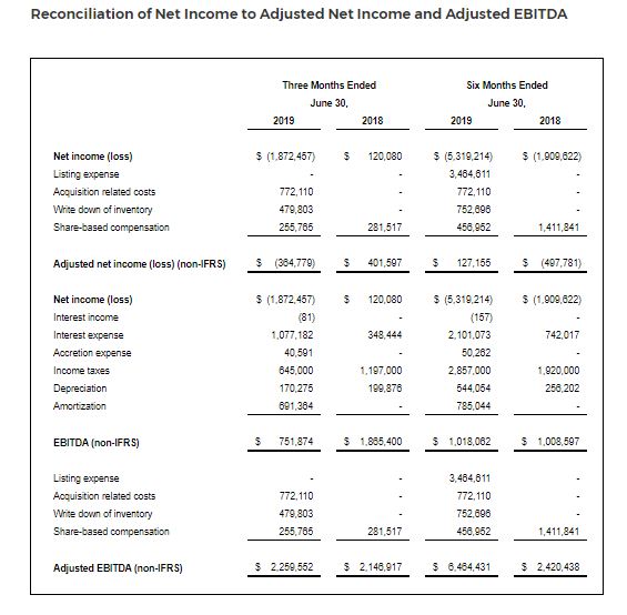 Q2 2019 EBITDA was $0.8 million, as compared to $1.9 million in Q2 2018. Adjusted EBITDA was $2.3 million in Q2 2019, as compared to $2.1 million in Q2 2018. Please refer to the Supplemental Information and Reconciliation of Non-IFRS Financial Measures at the end of this press release for additional information.