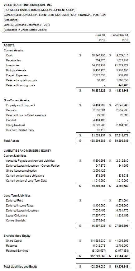Vireo Health Announces Second Quarter 2019 Financial Results