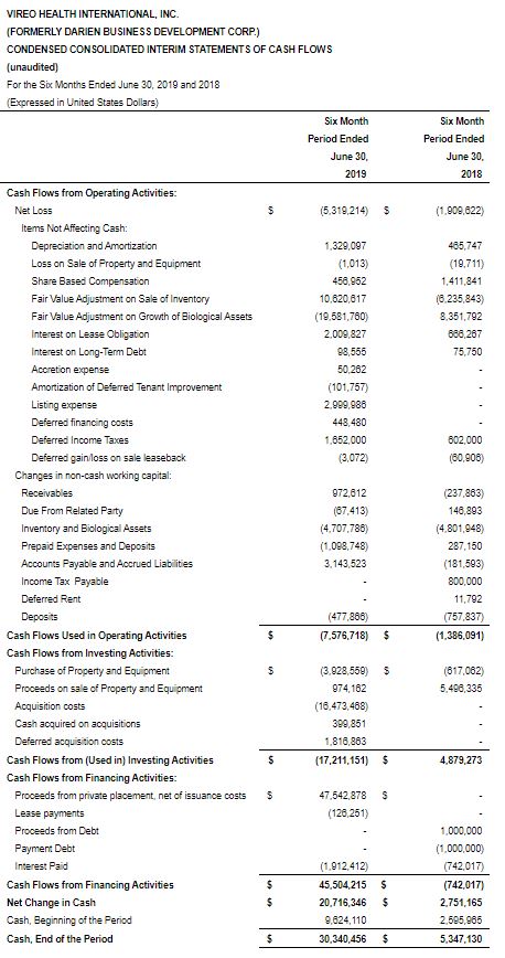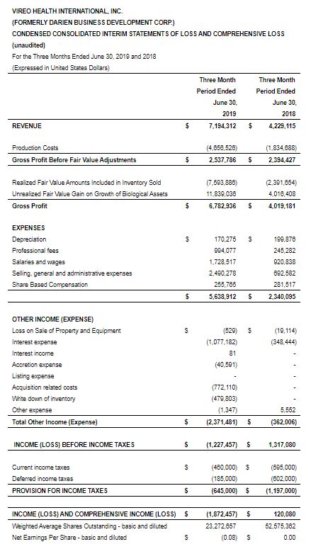 Net loss attributable to Vireo in Q2 2019 was $1.9 million, as compared to net income of $120,080 in Q2 2018. Adjusted net loss for Q2 2019 was $0.4 million, as compared to adjusted net income of $0.4 million in the prior year quarter.