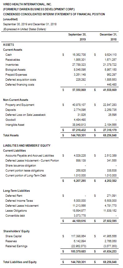 Vireo Health Announces Third Quarter 2019 Financial Results