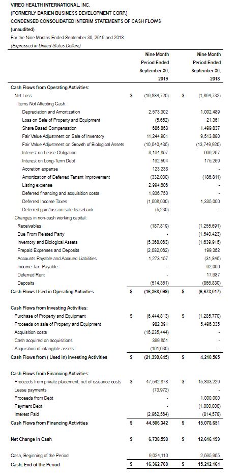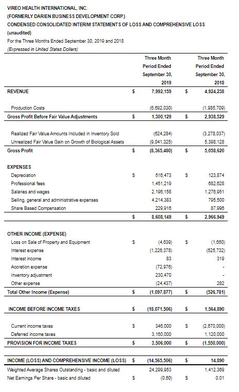 MINNEAPOLIS, Nov. 27, 2019 /PRNewswire/ — Vireo Health International, Inc. (“Vireo” or the “Company”) (CNSX: VREO; OTCQX: VREOF), a science-focused, multi-state cannabis company with operations in 10 states and the Commonwealth of Puerto Rico, today reported financial results for its third quarter ended September 30, 2019. All currency figures referenced in this release reflect U.S. dollar amounts.