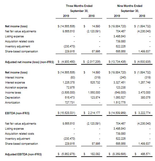 Q3 2019 EBITDA was a loss of $15.5 million, as compared to positive $2.2 million in Q3 2018. Adjusted EBITDA was a loss of $5.9 million in Q3 2019, as compared to positive $182,082 in Q3 2018. Please refer to the Supplemental Information and Reconciliation of Non-IFRS Financial Measures at the end of this press release for additional information.