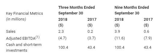 As at September 30, 2018, the Company had $100 million in cash, cash equivalents and short-term investments, total assets of $285 million, total liabilities of $61 million, and 291 million common shares outstanding.