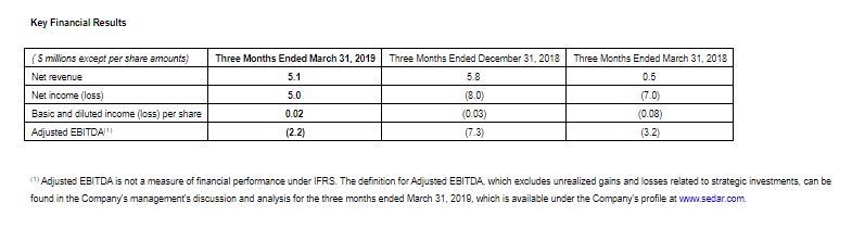 VIVO’s revenue decreased in the first quarter of 2019 as compared to the fourth quarter of 2018, as expected, as Q4 2018 sales benefited from initial product stocking for the adult-use market by provincial distributors. VIVO’s net income of $5.0 million (basic and diluted income of $0.02 per share) for the first quarter of 2019, as compared to its net loss of $8.0 million for the fourth quarter of 2018, was primarily attributable to an unrealized gain on financial assets of $8.9 million related to an increase in the market value of certain equity investments held by the Company, which is anticipated to be reversed in Q2 2019.