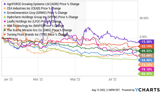 So far this earnings season, outlooks have been sharply reduced by GrowGeneration, Hydrofarm, Leafly, Scotts Miracle-Gro and WM Technology. They are struggling with the weakness of their customers with respect to capital spending, which we view as a temporary rather than permanent condition. The slowdowns in California, Oregon and Washington are impacting the businesses the most.